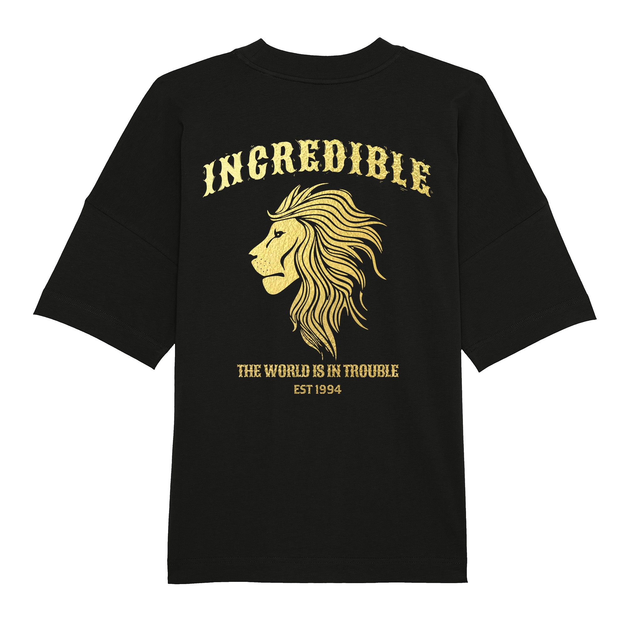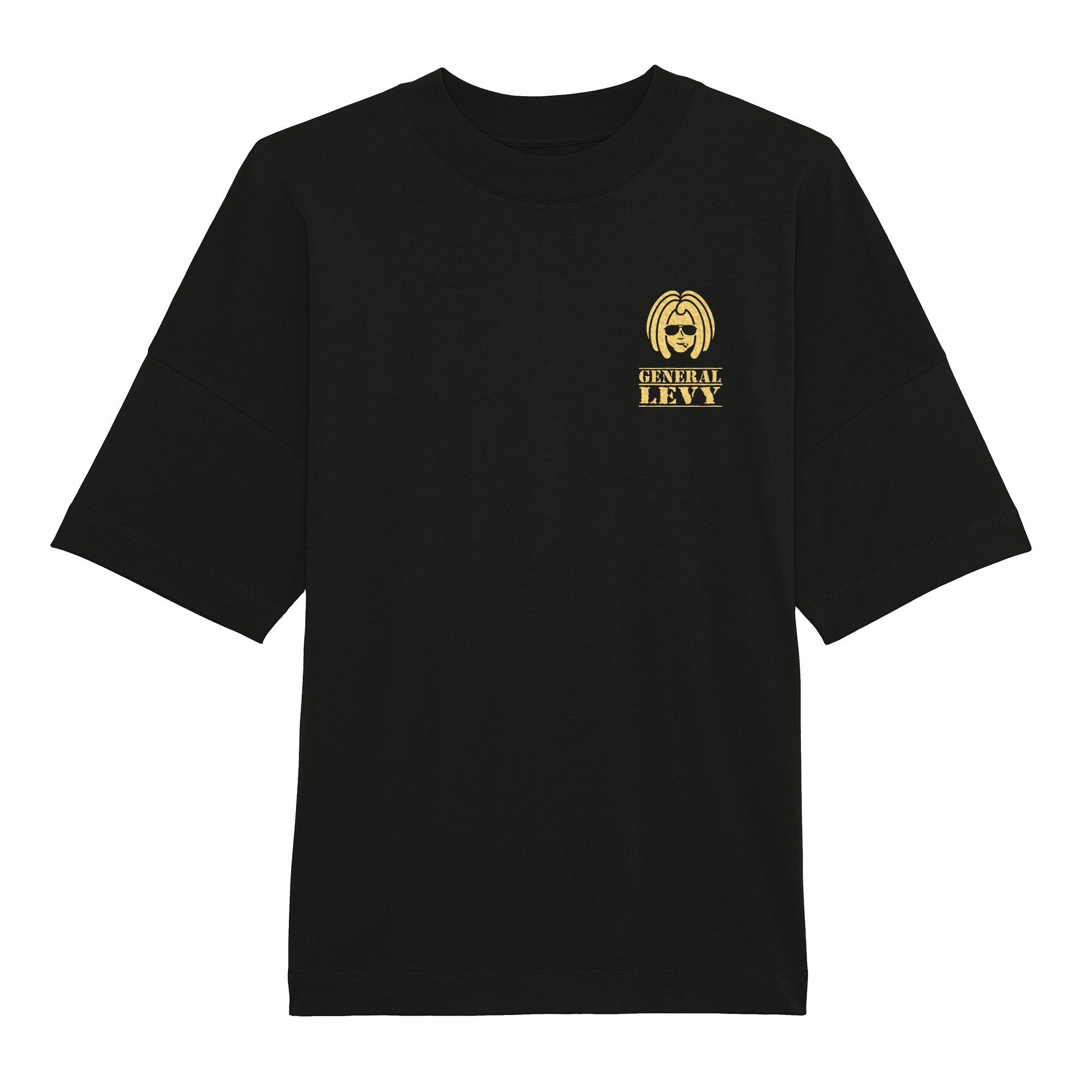 This super oversized and heavyweight t-shirt features a metallic gold print on the left breast and a big metallic gold print on the back.
