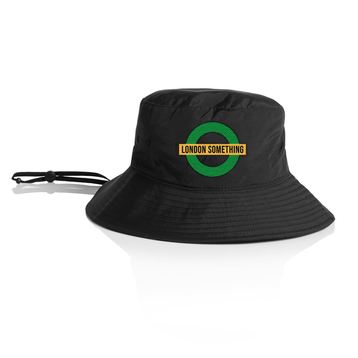 This London Something Carnival wide brim bucket hat has a print on the front.