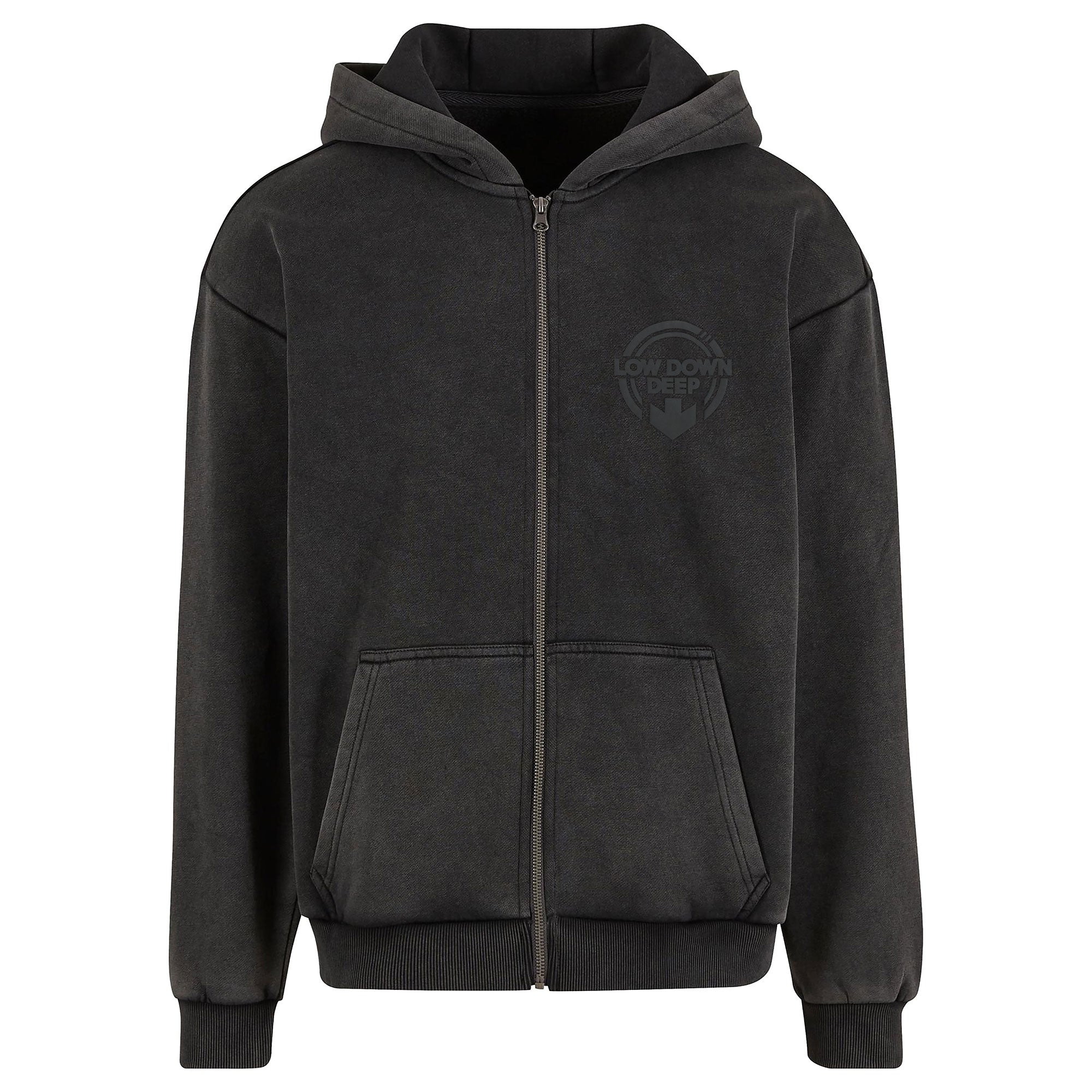 The Black On Black Vintage Washed Zip Hoodie from Low Down Deep features logos on the front and back in black puff print.