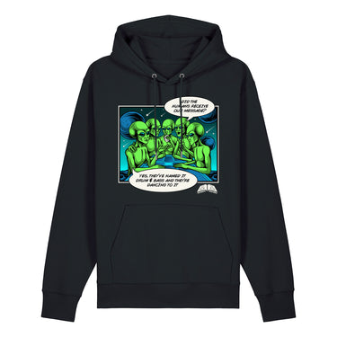 This Drum & Bass Bible hoodie features a big print on the front. Stay warm for the alien invasion.