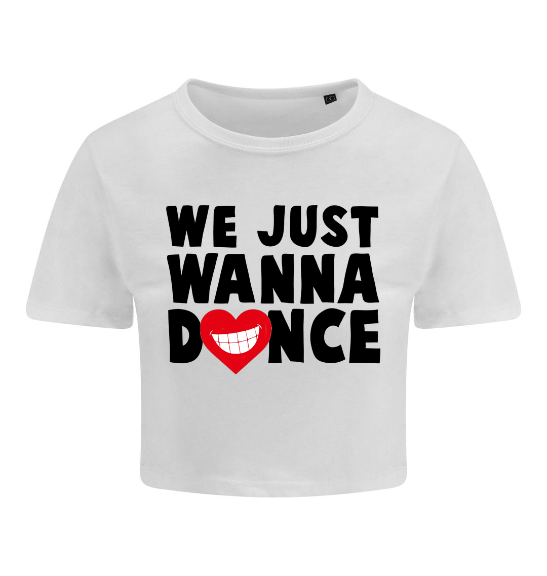 Ladies Crew! INJA presents the We Just Wanna Dance crop top. Say it loud and proud people. Dance like everyone is watching. This top features a big print on the front.