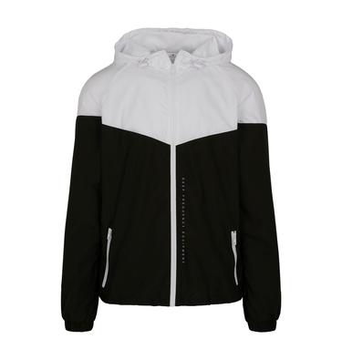 Mesh lined hood with drawstring closure with stoppers. Zipper side pockets. Elastic cuffs on sleeves.
