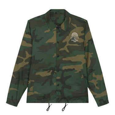 An all-over printed camouflage coach-style jacket featuring drawcord at the bottom hem, semi-elastic sleeve cuffs and an inside chest welt pocket.