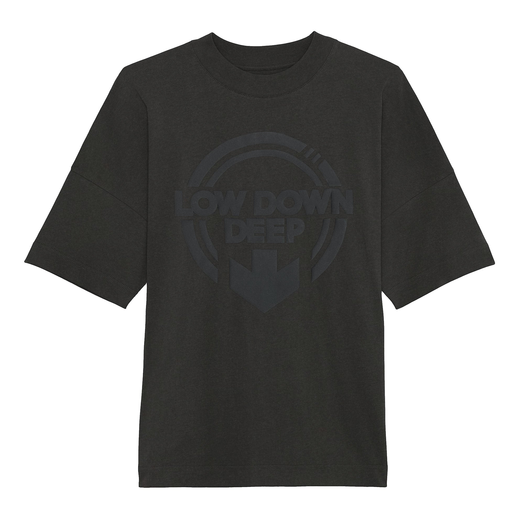 The Black On Black Vintage Washed Oversized T-Shirt from Low Down Deep features a logo on the chest in black puff print.