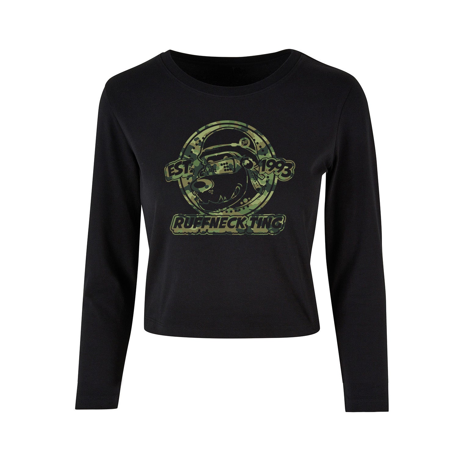 The classic Ruffneck Ting 1993 Ruffers logo now available in camo print on a black long sleeve cropped dance top.