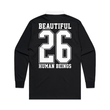 INFO: Cut and sew contrast stripe panel around centre. Heavyweight single Jersey. Contrast traditional woven rugby collar. Herringbone back neck tape. Contrast herringbone taped side vents. Taped shoulders. Elastane reinforced ribbed cuffs for shape retention. Twin-needle hem. Topstitching at armholes and panels. Concealed button placket. Herringbone inner placket. 2 x rubber buttons.